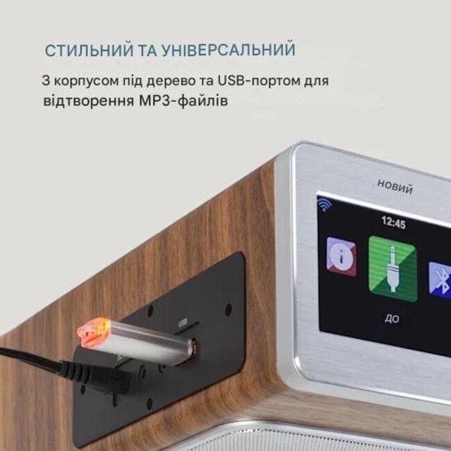 - Стильний і з можливістю підключення: з дерев’яним корпусом і USB-портом для відтворення MP3