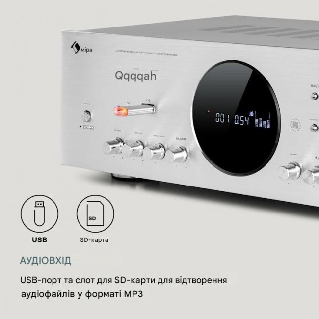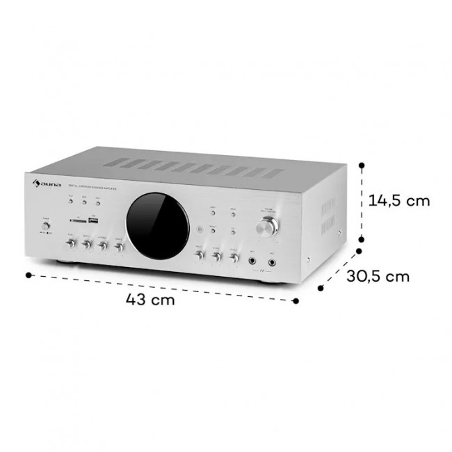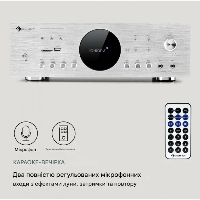 Оснащений інтерфейсом Bluetooth, усі аудіофайли можна зручно та бездротово відтворювати зі смартфона чи планшета на відстані до 20 метрів через цифровий підсилювач auna AMP-218 BT 5.1. Підсилювач отримує додатковий аудіовхід або через вхід AUX програвача компакт-дисків або стереосистеми, через вхід DVD або через USB-порт і слот SD з носія масової інформації. Два входи для мікрофона на передній панелі перетворюють підсилювач на повноцінну караоке-машину на наступній домашній вечірці з родиною та друзями. Звичайно, сигнали можна контролювати з точки зору гучності, низьких і високих частот, а також забезпечувати ефектами відлуння, повтору та затримки.
