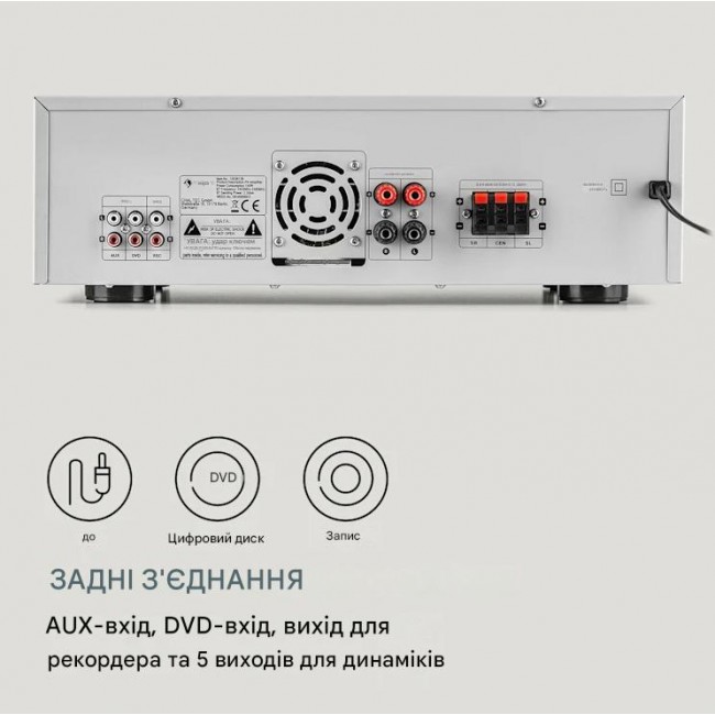 - Задні роз’єми: 1 x стерео RCA AUX-IN, 1 x стерео RCA DVD-IN, 1 x стерео RCA-вихід для запису/сабвуфера, 2 x стерео гвинтові роз’єми/вихід для гучномовця, 3 x стереороз’єми для виходу на гучномовець