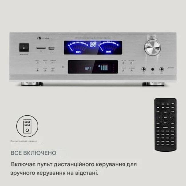Оснащений інтерфейсом Bluetooth, усі аудіофайли можна зручно та бездротово відтворювати зі смартфона, планшета чи ноутбука через стереопідсилювач на відстані 20 метрів. Завдяки вихідній потужності 2 x 120 Вт і 3 x 50 Вт RMS і відповідним роз’ємам на задній панелі пристрою підтримуються до 5 динаміків, сабвуфер і DVD-програвач із чудовим звуком. Стереопідсилювач auna AMP 5100 BT також має порт USB і слот SD на передній панелі для легкого відтворення MP3, два порти для мікрофона з регульованими високими і басами, а також 3,5 мм вхід AUX для підключення зовнішніх аудіопристроїв. Два VU вимірювачі візуально відображають рівень звуку і надають стереопідсилювача сучасний і привабливий вигляд. Пульт дистанційного керування, що входить у комплект, також забезпечує зручне керування на відстані.