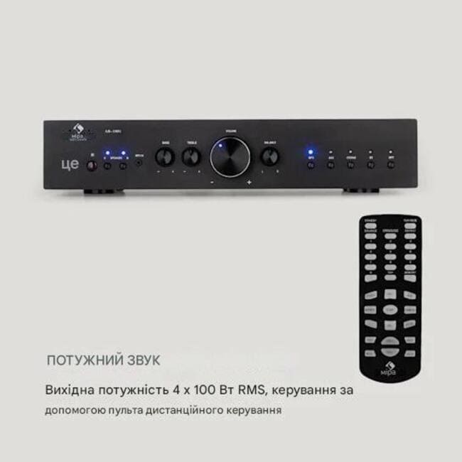- Вихідна потужність: 4 x 100 Вт RMS (при 4 Ом)
