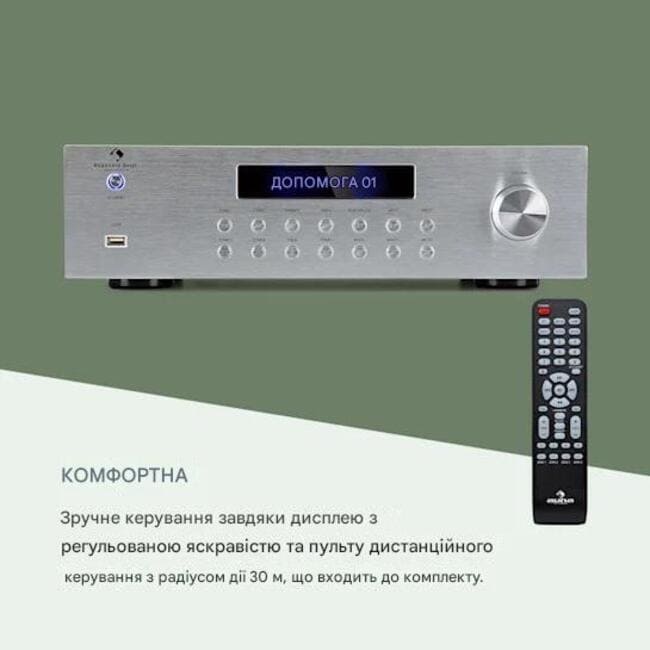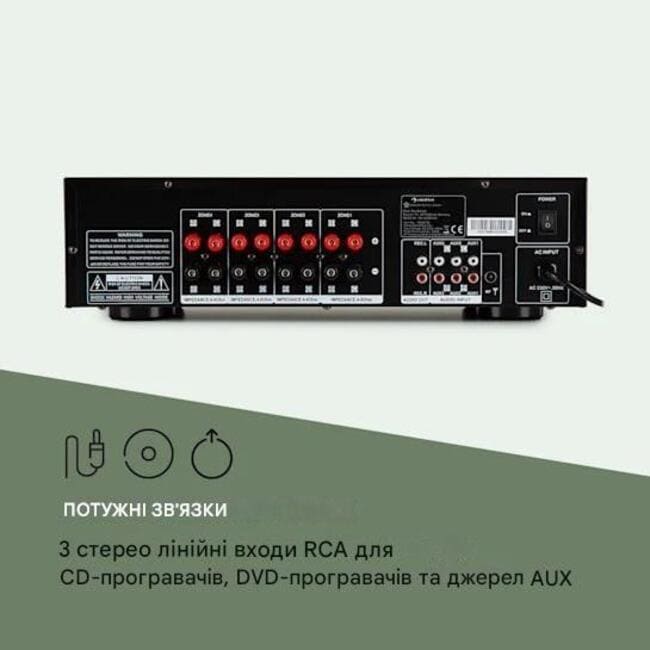 - Підключення: 3 x стерео входи RCA AUX, 1 x аудіовихід REC, 1 x порт USB, 1 x вхід для радіочастотної антени, 4 x 2 роз’єми для динаміків
