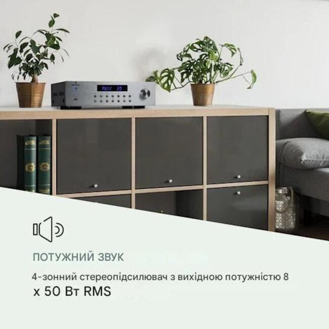- Вихідна потужність: 8 x 50 Вт RMS