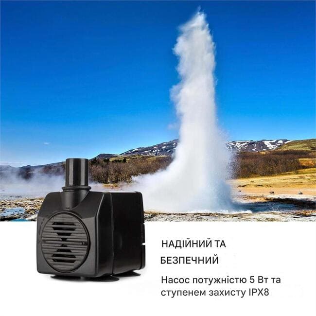 - Надійний та безпечний: насос потужністю 5 Вт та класом захисту IPX8