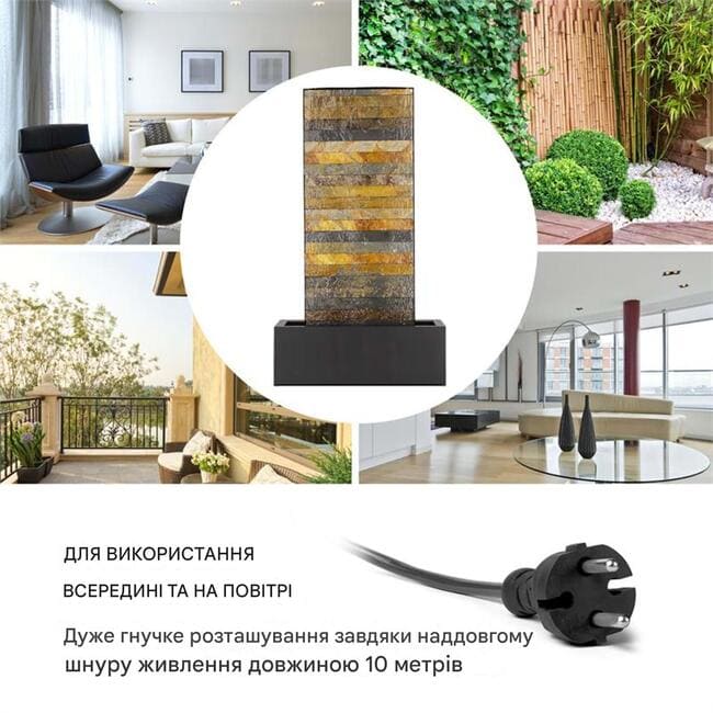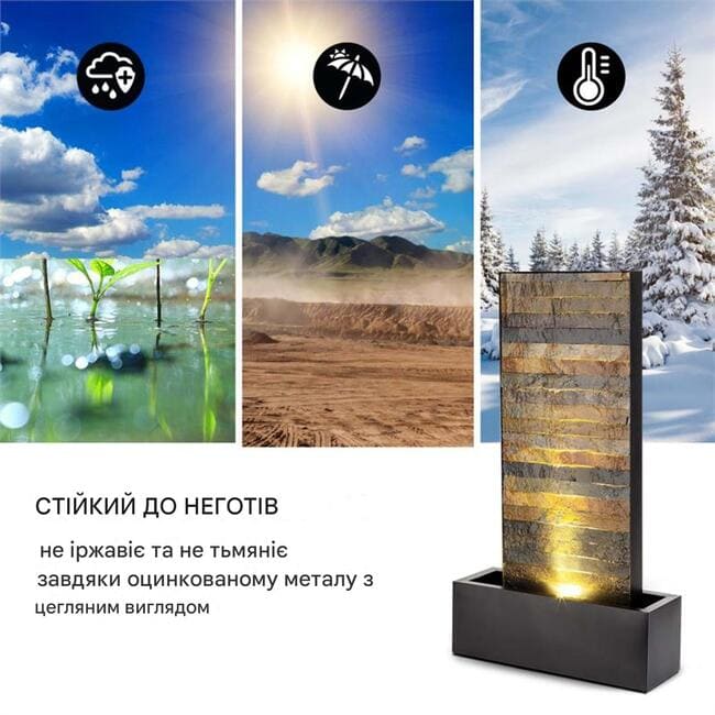 Атмосферно освітлена дванадцятьма світлодіодами, вода стікає по вертикальній поверхні постійним потоком, забезпечуючи таким чином медитативну релаксацію. Фонтан Raincastle не тільки надзвичайно міцний і довговічний, виготовлений з оцинкованого металу, але також має оманливий вигляд справжньої цегли. Щоб вода ніколи не вичерпалася, її постійну циркуляцію підтримує насос потужністю 8 Вт. Завдяки наддовгому кабелю живлення довжиною 10 м садовий фонтан можна вільно розмістити, і він знайде ідеальне місце будь-де.