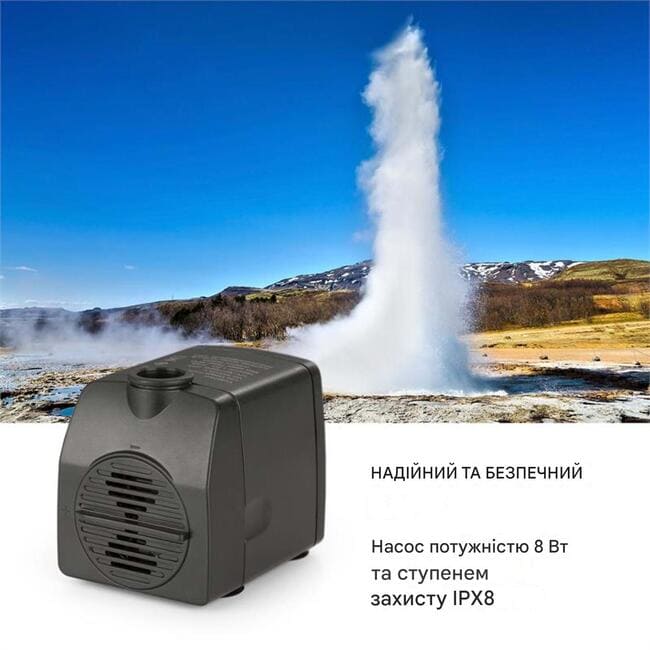 - Надійний і безпечний: насос потужністю 8 Вт і класом захисту IPX8