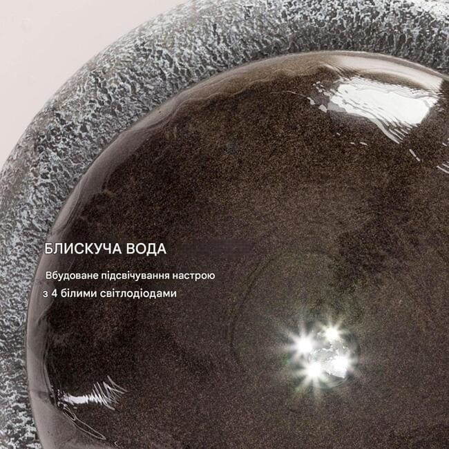 Фонтан, виготовлений з напрочуд легкого і надзвичайно міцного полірезину, має таку форму, що мимоволі нагадує складені один на одного валуни. Це враження посилюється водою, що б'є з найвищої точки, яка стікає назад в резервуар зовні фонтану. Атмосферне світло чотирьох білих світлодіодів на виході змушує воду іскритися, немов у стрімкому потоці, де заломлюються сонячні промені.