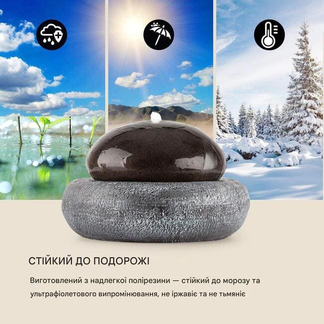 - стійкість до погодніх умов: виготовлений із надлегкого полірезину - стійкий до морозу та ультрафіолетового випромінювання, довговічний, не іржавіє і не тьмяніє
