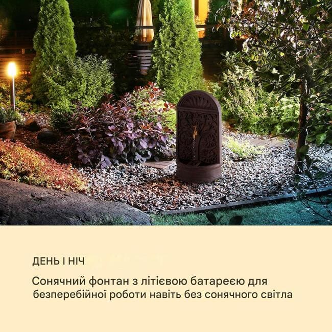 День і ніч: сонячний фонтан з літієвою батареєю для плавної роботи навіть без сонячного світла
