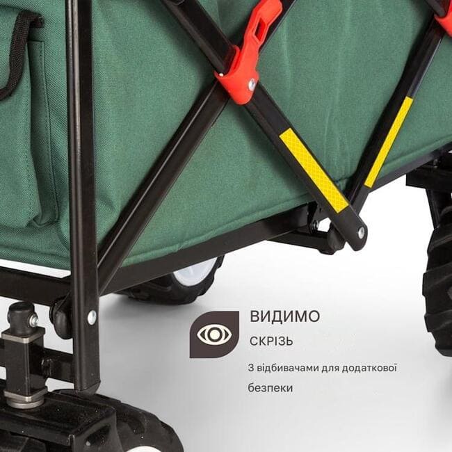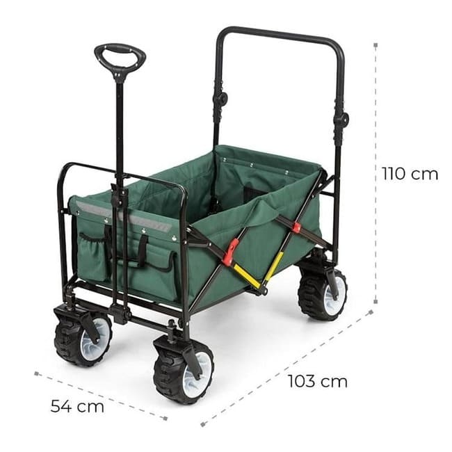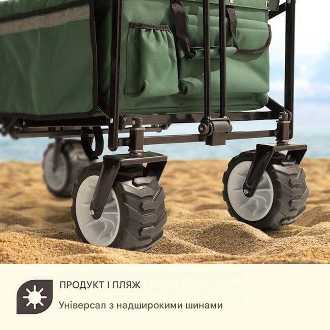 Кишені на зовнішній стороні візка підходять для зберігання невеликих предметів, таких як пляжне приладдя або іграшки. Надзвичайно широкі пластикові колеса товщиною 10 см можна використовувати майже на будь-якій поверхні та легко забезпечать необхідне зчеплення. Це також робить шлях через піщані дюни дитячою грою. Після використання складна рамна конструкція, виготовлена з міцної трубчастої сталі, дозволяє швидко скласти зручного помічника та зберігати його, щоб заощадити місце.