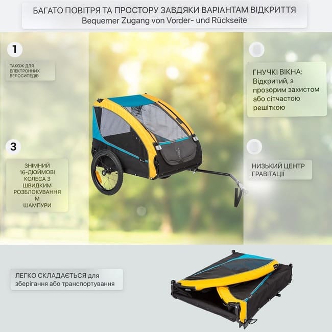 Розміри причепа (включно з дишлом): приблизно 75 x 85 x 137 см (ШxВxГ).