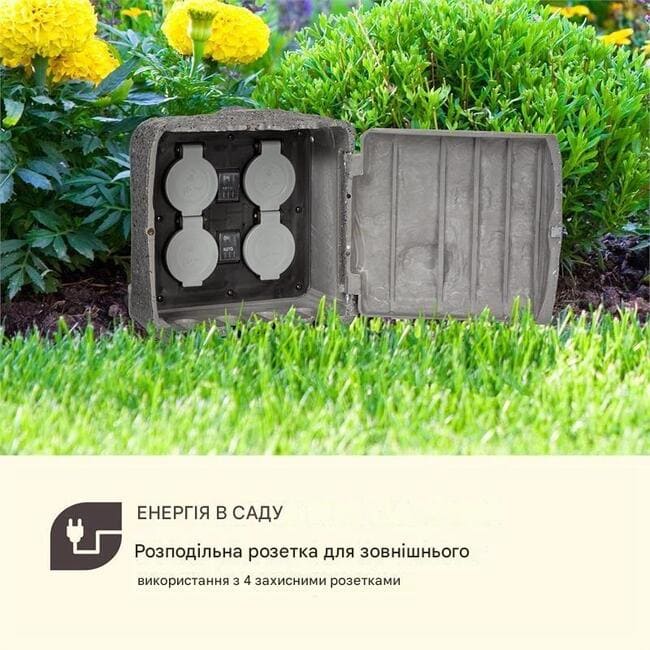 Power Rock Twilight 5 4- контактна садова розетка IP44 сутінковий датчик 5 м сірий Енергія в саду або у дворі. Завдяки розетці для каменів Waldbeck Power Rock Twilight завжди можна під'єднати газонокосарку, електричний гриль або освітлення для вечірок із повністю захищеним від негоди під'єднанням — без подовжувального кабелю. Садова розетка Waldbeck Power Rock Twilight приховує у своїй елегантній внутрішній частині з АБС-пластику загалом 4 розетки та забезпечує загальну потужність до 3680 Вт. Кожна розетка добре захищена від води та сторонніх предметів за класом захисту IP44. Відкидні дверцята, що щільно закриваються, з магнітним тримачем приховує розетки всередині розподільної станції. Вирізи дають змогу легко прокладати кабелі навіть у разі зачинених дверей. Power Rock Twilight особливо зручний, коли темніє. В автоматичному режимі вбудований сутінковий датчик забезпечує увімкнення до двох розеток, наприклад, для увімкнення зовнішнього освітлення, фотоловичок або систем відлякування тварин у нічну пору. Коли вранці знову стає світло, датчик також автоматично знову вимикає розетки. Щоб декоративний штучний камінь під граніт не захопив завислих сусідів, його можна просто прикрутити до наявної тротуарної плитки або стін. Необхідний монтажний матеріал входить до комплекту постачання. З іншого боку, можна встановити кілочок, що заземлює, завдовжки 13 см і використовувати його для надійного кріплення на газонах або насипах. Кам'яна розетка має з'єднувальний кабель завдовжки 5 м для вільного розміщення в саду. Вулична розетка Waldbeck Power Rock Twilight — це простий спосіб забезпечити ваш сад і двір практичними варіантами під'єднання до електромережі.