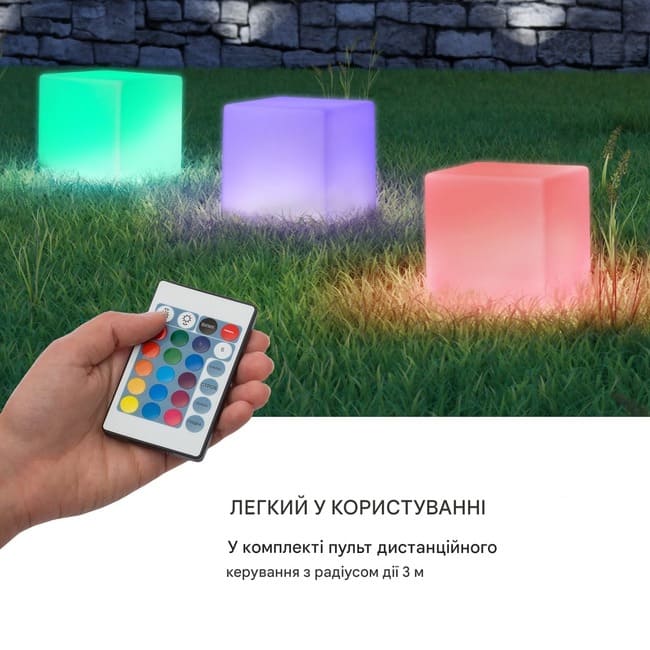 Світловий куб розміром 40 x 40 x 40 см має водонепроникність IP68 проти дощу або снігу і чудово підходить для декоративного освітлення садів, балконів або терас. Завдяки своїй стабільній формі та вантажопідйомності до 120 кг, він також підходить як сидіння. Shinecube XL від Blumfeldt особливо привабливий завдяки чотирьом режимам зміни світла. Він може використовувати функцію згладжування, щоб м’яко переходити від одного кольору до іншого, або використовувати функцію спалаху, щоб усі кольори яскраво спалахували один за одним. Функція стробоскопа змушує світлодіоди швидко мерехтіти, тоді як режим згасання змушує їх яскраво світитися, а потім дуже повільно згасати. Це означає, що світловий куб пропонує освітлення для будь-якої події, будь то жвава вечірка біля басейну, сімейне свято або романтична вечеря при свічках для двох. Звичайно, розсіяне світло також підходить як частина різдвяної прикраси.