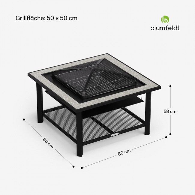 Розмістивши решітку з нержавіючої сталі, ви також можете смажити на палаючому вогні. Незалежно від того, чи це сосиски, овочеві шашлики, стейки чи сир – димний аромат може забезпечити справжню насолоду. У комплект поставки також входить практична кочерга та кришка для вогню. Вогнище 3 в 1 від blumfeldt можна будь-коли та за лічені секунди перетворити на декоративний столик.