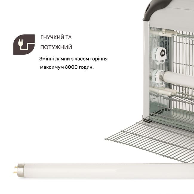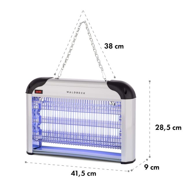 Із знищувачем комах Waldbeck Mosquito Ex 4000 ви постійно захищені від дзижчання фуражирів і жалючих п’явок. Потужний пристрій потужністю 30 Вт приваблює шкідників своїм непереборним виглядом без запаху та тихим виглядом: 2 лампи потужністю 10 Вт потужністю в трубці випромінюють ультрафіолетове світло в навколишнє середовище та таким чином приваблюють комах у безпосередній близькості. Високоякісна металева сітка всередині пастки для комах забезпечує жертвам сильний смертельний удар напругою 2500 В і робить непотрібним використання хімікатів і токсичних речовин. Завдяки ефективному радіусу дії 100 м² практичний демінатор підходить для будь-яких приміщень у вашому домі, офісі чи стайні. Нешкідливі комахи потрапляють в контейнер, який можна легко вийняти з пристрою, а потім очистити. Захисна решітка, яка запобігає зовнішньому контакту з проводами живлення, також легко знімається і миється. Практичний підвісний пристрій використовується для встановлення в недоступному для дітей та домашніх тварин місці, яке можна відрегулювати на потрібну висоту за допомогою ланцюжка, що входить у комплект.