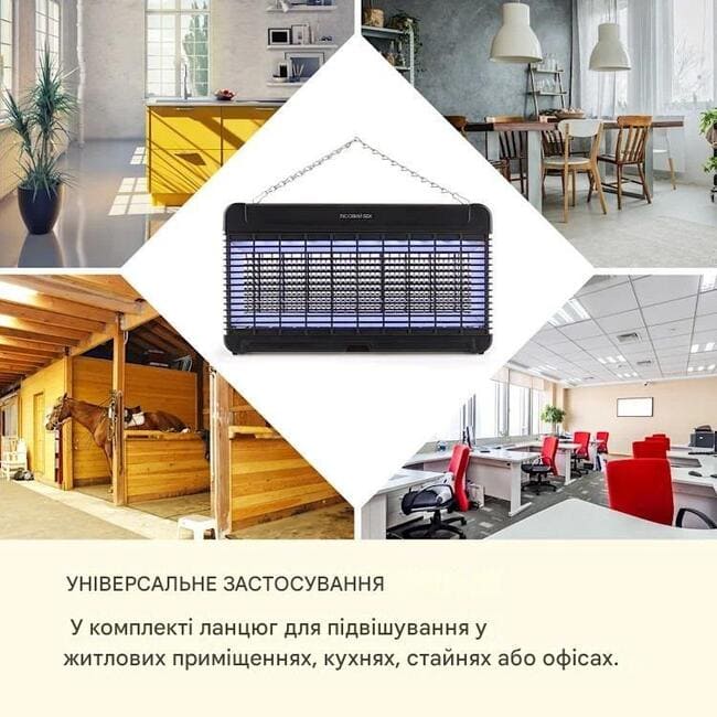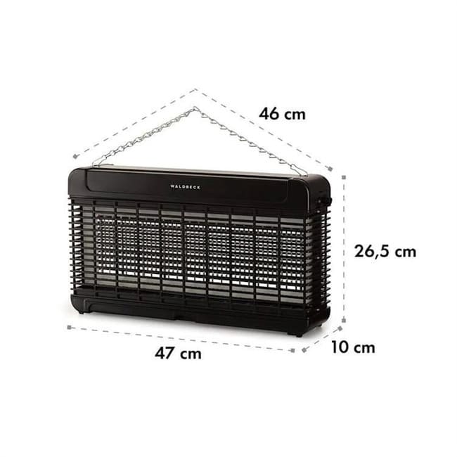 Пастка для комах Mosquito Ex 9500 LED допомагає знищити комарів, мух та інших докучливих шкідників у квартирах, кухнях або стайнях завдяки енергозберігаючому споживанню 13 Вт і створює полегшення без будь-яких хімікатів. Комахи приваблюються високоякісними УФ-А світлодіодами зі спектром 365 нм і швидко і безболісно вбиваються 4000 В. Концепція Attraction360 із відкритою конструкцією може забезпечити доступ з усіх сторін. Практична ланцюгова підвіска дозволяє підвісити пристрій до стелі в недоступному для дітей або тварин місці.