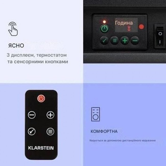 Завдяки реалістичному світлодіодному полум’ю електричний камін Klarstein Dukono перенесе вас у затишний комфорт камінної кімнати. Встановлений прямо у вашому домі, він може забезпечити комфорт і заспокійливе тепло завдяки своєму двоступінчастому нагрівальному елементу. Яскравість і температуру полум'я можна регулювати індивідуально за смаком. Завдяки вбудованому таймеру та практичному пульту дистанційного керування Dukono не залишає бажати кращого. Сучасний дизайн у поєднанні з відділенням для дров на нижній стороні доповнює вигляд каміна.