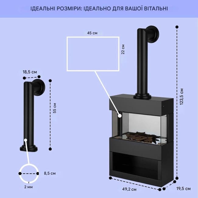 Розміри отвору димоходу: приблизно 45 х 22 см (Ш х В)
