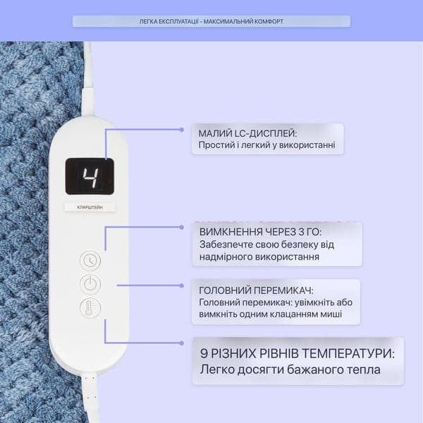 • Знімна панель управління (вимкнено, рівні температури 1-9, таймер вимкнення рівні 1-9)