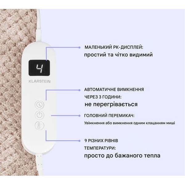 - Знімна панель управління (вимкнено, рівні температури 1-9, таймер вимкнення рівні 1-9)