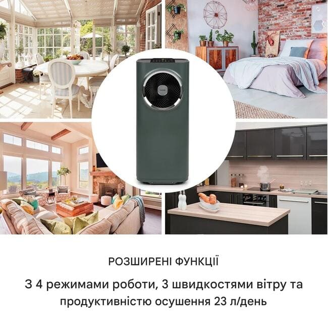 • Широкі функції: 4 режими роботи, 3 швидкості вітру та продуктивність осушення 23 л/год.