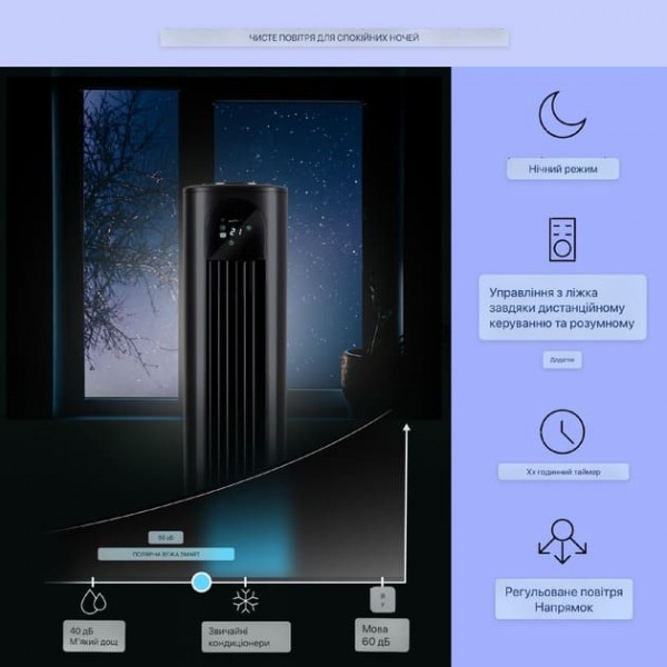 Ще одна перевага — функція іонізації, що допомагає усунути пил та неприємні запахи. Це дозволяє насолоджуватись не лише прохолодним, а й чистим повітрям.