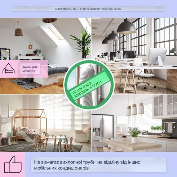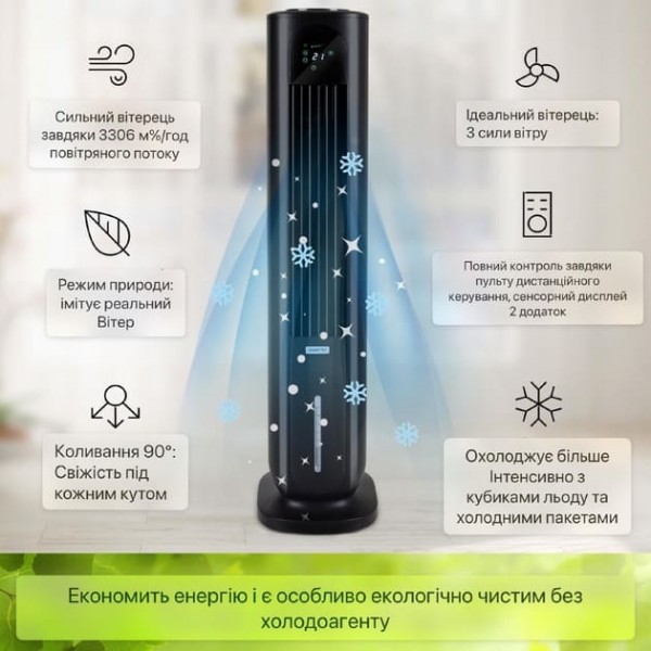 При споживанні всього 85 Вт пристрій є енергоощадною альтернативою кондиціонеру, тому може працювати довго без перевитрат електроенергії. А завдяки роликам його можна легко переміщати між кімнатами.