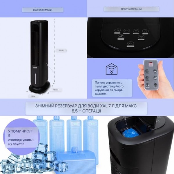 Охолодження відбувається природним способом — за рахунок випаровування води з 7-літрового резервуара. При потребі у бак можна додати спеціальні льодові акумулятори, які посилять ефект. Резервуар легко знімати для миття або наповнення.