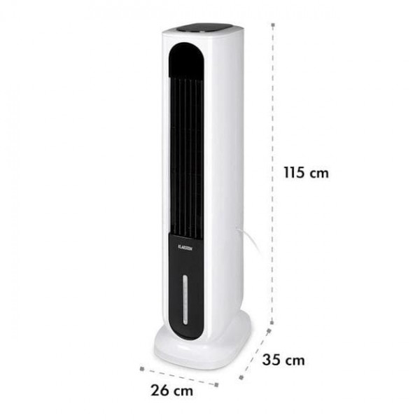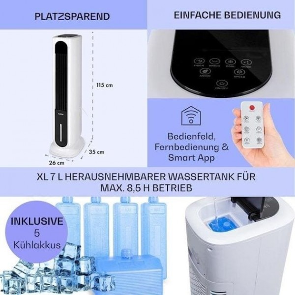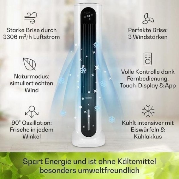 освіжаючий ефект ще більше посилюється. Навколишнє повітря охолоджується за допомогою природного принципу випаровування води: повітроохолоджувач 4-в-1 всмоктує тепле повітря через задню частину пристрою та зволожує його. Повітря стає холоднішим за рахунок природного випаровування і витікає потоку повітря. Це забезпечує точне відновлення для тіла під час будь-якої діяльності. Крім того, повітря збагачене приємною вологою, що забезпечує полегшення, особливо в сухі спекотні дні або коли повітря сухе від опалення взимку. За тривалий термін експлуатації в резервуар можна залити до 7 літрів води. Загалом п’ять змінних пакетів із льодом для резервуару для води можуть знизити температуру, якщо потрібно, для ще більшого освіження. Резервуар для води можна повністю зняти для легкого наповнення, очищення та спорожнення. А з максимальним загальним споживанням електроенергії 85 Вт Polar Tower Smart є екологічно чистою альтернативою кондиціонуванню повітря, особливо при безперервній роботі.