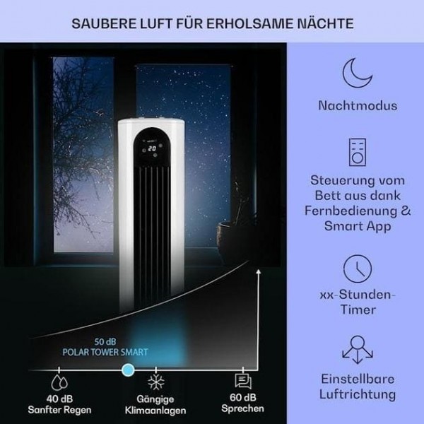 Особливо розумний, коли справа доходить до збереження холоднокровності. Використовуючи Wi-Fi-з’єднання, ви можете легко віддавати команди повітроохолоджувачу Klarstein Polar Tower Smart за допомогою програми Klarstein зі свого смартфона або iPhone – з будь-якого місця. Звичайно, ви також можете регулювати комфортний повітряний потік відповідно до ваших індивідуальних побажань за допомогою панелі керування або пульта дистанційного керування. Чотири швидкості вітру, перемикання горизонтальних коливань і таймер вимкнення, який можна встановити по годинах на 24 години, дозволяють точно налаштувати відповідні потреби в освіжанні. Крім того, Klarstein Polar Tower Smart має три різних режими роботи. На додаток до звичайного режиму, режим природи імітує підйом і спад вітру. Нічний режим працює за аналогічним принципом, але поступово знижує максимальну швидкість вітру, поки пристрій остаточно не перестане працювати. Klarstein Polar Tower Smart також є очищувачем повітря . Функція іонізатора, що перемикається, ефективно видаляє з повітря частинки пилу та неприємних запахів і дозволяє вільно дихати. У поєднанні з повітроохолоджувачем