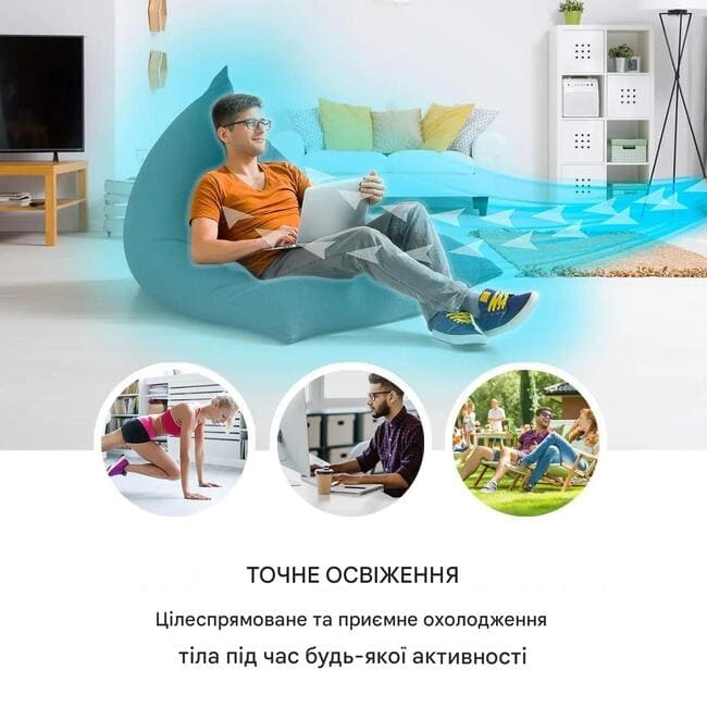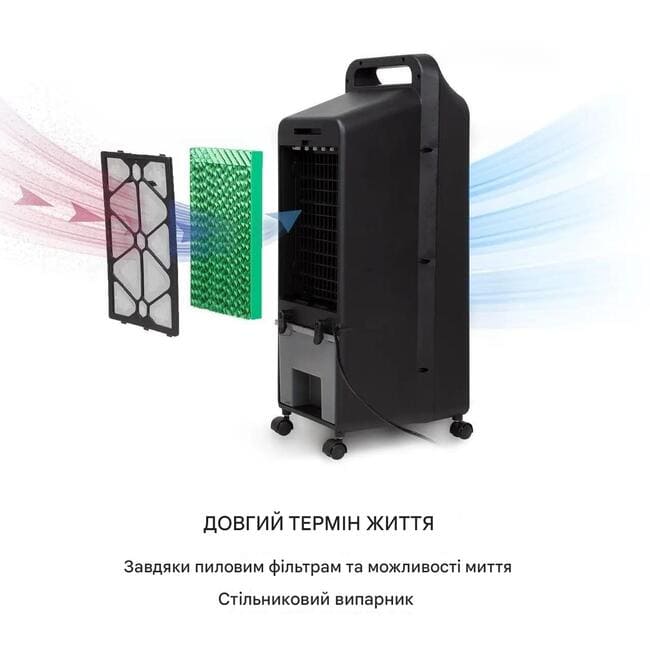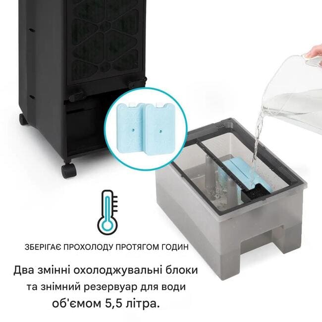 У поєднанні з функцією охолодження повітря освіжаючий ефект ще більше посилюється. Навколишнє повітря охолоджується за допомогою природного принципу випаровування води: повітроохолоджувач 3-в-1 всмоктує тепле повітря із задньої панелі пристрою та зволожує його. Повітря стає холоднішим за рахунок природного випаровування і витікає потоку повітря. Це може забезпечити точне відновлення для тіла під час будь-якої діяльності. Крім того, повітря збагачене приємною вологою, що може забезпечити полегшення, особливо в сухі спекотні дні або коли повітря сухе від опалення взимку. За тривалий термін експлуатації в резервуар можна залити до 5,5 літрів води. Два змінних пакети для льоду для резервуара для води можуть знизити температуру, якщо потрібно, для ще більшого освіження. Резервуар для води можна повністю зняти для легкого наповнення, очищення та спорожнення. А з максимальним загальним споживанням електроенергії 45 Вт Cooler Rush є екологічно чистою альтернативою кондиціонуванню повітря, особливо при безперервній роботі.