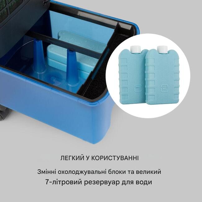 - Охолоджуйте протягом годин: два пакети з льодом і резервуар для води об'ємом 7 літрів