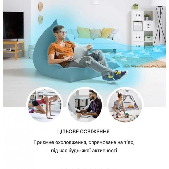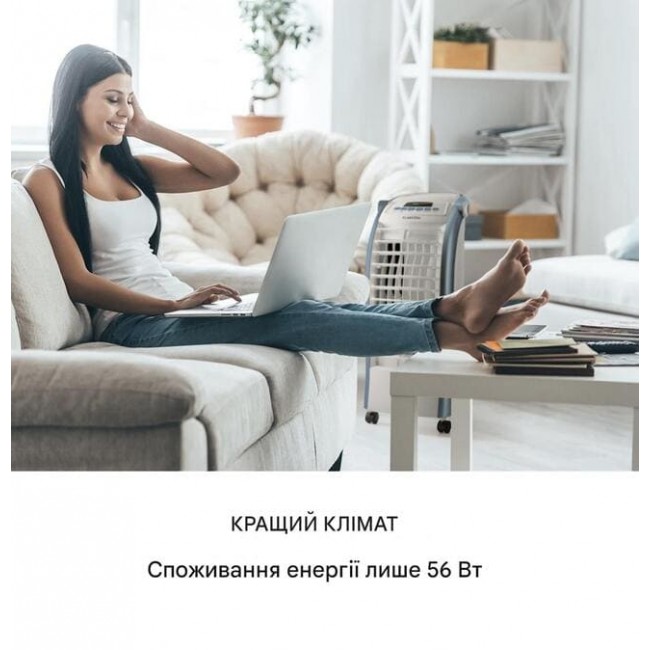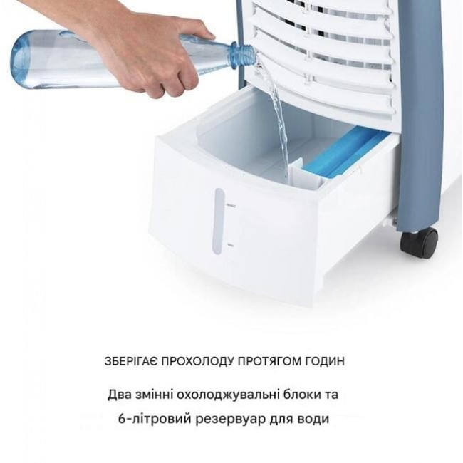 У поєднанні з функцією охолодження повітря освіжаючий ефект ще більше посилюється. Навколишнє повітря охолоджується за допомогою природного принципу випаровування води: повітроохолоджувач 3-в-1 всмоктує тепле повітря через задню частину пристрою та зволожує його. Повітря стає холоднішим за рахунок природного випаровування і витікає потоку повітря. Це забезпечує точне відновлення для тіла під час будь-якої діяльності. Крім того, повітря збагачене приємною вологою, що забезпечує полегшення, особливо в сухі спекотні дні або коли повітря сухе від опалення взимку. За тривалий термін експлуатації в резервуар можна залити до 6 літрів води. Два змінних пакети для льоду для резервуара для води можуть знизити температуру, якщо потрібно, щоб отримати ще більше освіження. Резервуар для води можна повністю зняти для легкого наповнення, очищення та спорожнення. Споживаючи лише 55 Вт електроенергії, Maxfresh Ocean є екологічно чистою альтернативою кондиціонуванню повітря, особливо при безперервній роботі.