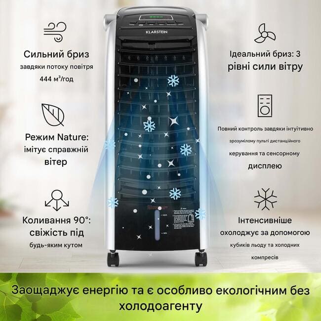 Охолодження здійснюється за допомогою природного випаровування води, що забезпечує відчутну свіжість. Великий резервуар об’ємом 6 літрів дозволяє пристрою працювати тривалий час без необхідності частої доливки. У комплект входять 2 акумулятори холоду, які підсилюють охолоджувальний ефект. Знімний бак легко миється та обслуговується.