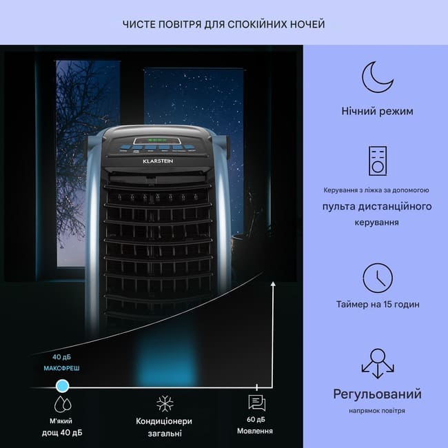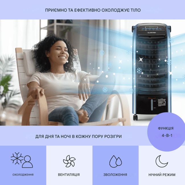 - Ефективність 4-в-1: вентилятор, охолоджувач повітря, зволожувач і нічний режим