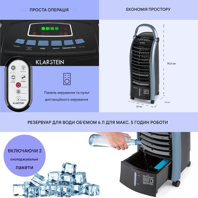 Klarstein Maxfresh має три різних режими роботи: звичайний режим, природний режим, який імітує зростання та спад вітру, і нічний режим, який також зменшує швидкість вітру до повної зупинки. У поєднанні з функцією охолодження повітря ефект освіження посилюється за рахунок випаровування води. Для тривалого терміну служби резервуар можна наповнити до 6 літрами води, а два змінних холодних пакети ще більше знижують температуру. Резервуар для води можна повністю зняти для легкого наповнення, очищення та спорожнення.