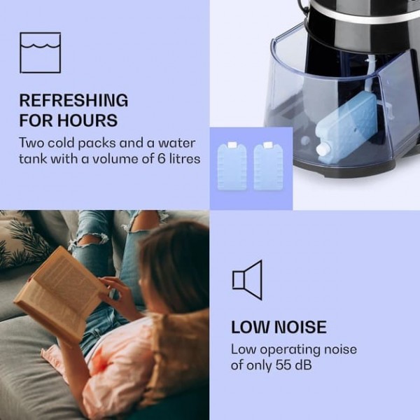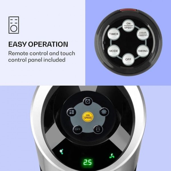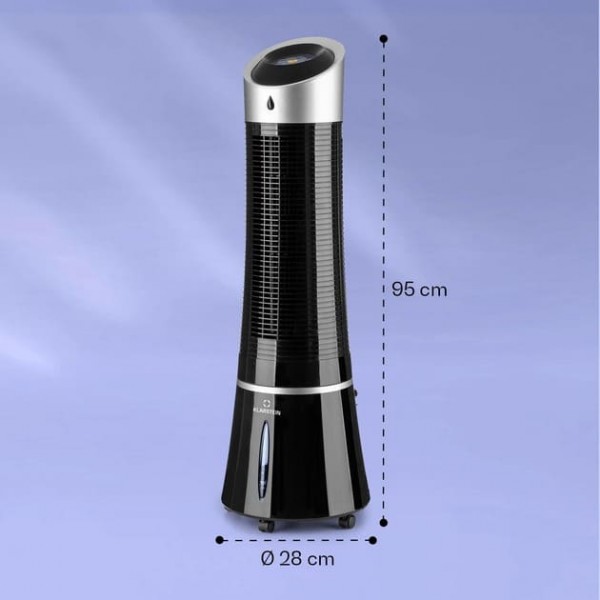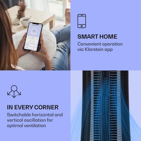 У надзвичайно розумний спосіб ви можете зареєструвати Skyscraper Ice Smart у своїй домашній мережі WiFi, а потім зручно керувати ним з будь-якого місця за допомогою програми Klarstein. Завдяки потужному потоку повітря 210 м³/год вентилятор Klarstein Skyscraper Ice Smart приводить в рух мляве літнє повітря та створює приємний бриз на трьох швидкостях. У поєднанні з функцією охолодження повітря потік повітря додатково приємно охолоджується за рахунок випаровування води та забезпечує точне освіження. Це робить Klarstein Skyscraper Ice Smart бажаним помічником не лише влітку: як зволожувач повітря він оголошує війну сухому нагрівальному повітрю взимку. Вертикальне і горизонтальне коливання забезпечують розподіл повітря в приміщенні. Вбудований іонізатор ефективно видаляє частинки пилу та запахи з повітря.