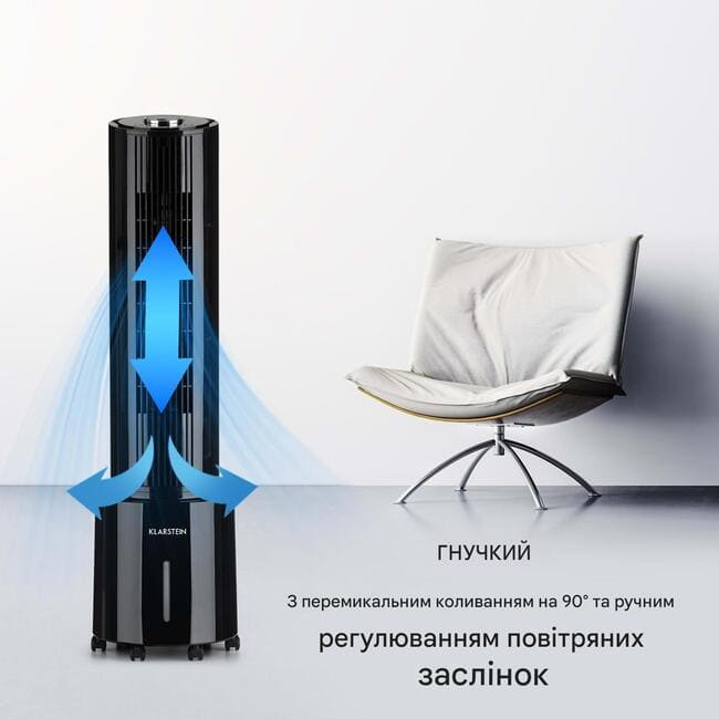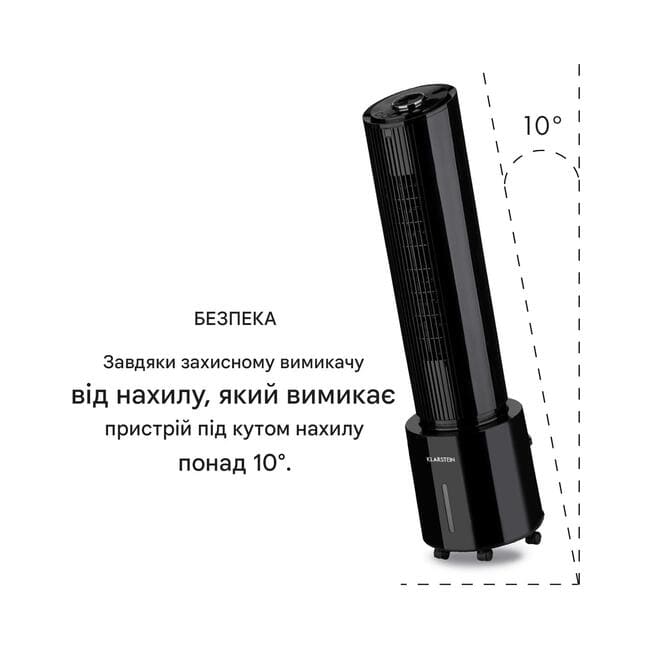 Klarstein Waterfall є не тільки бажаним помічником влітку: Як зволожувач повітря, він брує війну сухого нагрівання повітря у зимовий період . Якщо необхідно освіжити понад одну людину, ви можете активувати її коливання на 90°. Для більшої гнучкості ви також можете відрегулювати повітряні заслінки по горизонталі. Вбудований іонізатор , який ефективно видаляє частинки пилу та бруду з повітря, забезпечує найкраще дихання . Завдяки підлоговим роликам повітроохолоджувач Klarstein Waterfall можеможна брати куди завгодно та готовий до негайного використання. Він керується з панелі керування й поворотної ручки на верхній частині пристрою або зручно за допомогою пульта дистанційного керування. Вимикач захисту від перекидання гарантує необхідну безпеку й автоматично вимикає пристрій у разі кута нахилу понад 10°.