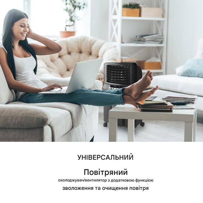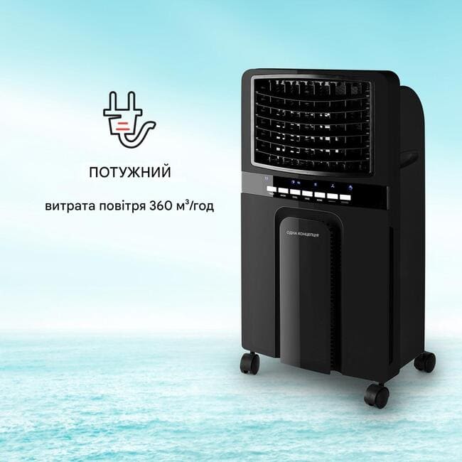 Свіжість Балтійського моря. З повітряним охолоджувачем oneConcept Baltic Black свіжий вітерець віє у ваші чотири стіни навіть у спекотні літні дні. Розумний пристрій 3 в 1 – це комбінація вентилятора, охолоджувача повітря та зволожувача.