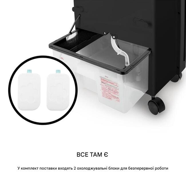 Будучи чистим вентилятором , Baltic Black змушує свої ламелі вібрувати горизонтально на трьох рівнях швидкості та створює освіжаюче дихання, навіть коли повітря скрізь буквально застійне. Таким чином пристрій переміщує до 360 м³ повітря за одну годину. Якщо зараз увімкнути функцію охолодження, повітроохолоджувач починає випаровувати воду зі свого 6-літрового бака, що помітно охолоджує повітря, що проходить повз. Цей процес базується на суто фізичних принципах і тому не потребує охолоджуючої рідини та дуже низьку потребу в енергії лише 65 Вт. Щоб ще більше підвищити ефективність охолодження, пакети з льодом, що входять у комплект, можна заморозити та додати в резервуар для води або просто додати кубики льоду в резервуар для води. Це робить oneConcept BalticBlue бажаним помічником як зволожувач навіть взимку, оскільки він безперервно зволожує сухе повітря, що нагрівається, і таким чином забезпечує полегшення проблемних слизових оболонок. Повністю мобільний повітроохолоджувач 3-в-1 слідує за вами в будь-яке місце завдяки своїм підлоговим роликам, щоб освіжити вас саме там, де вам це потрібно: за робочим столом, на дивані чи під час приготування їжі на кухні. Baltic Black поставляється з власним пультом дистанційного керування для зручного керування.