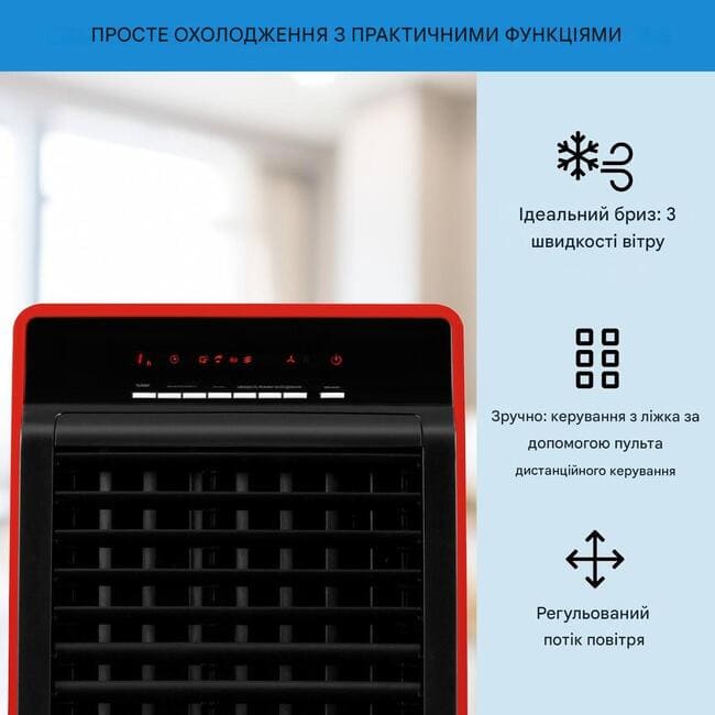 Бажаєте прохолодного вітерця? Не біда, вентилятор oneConcept CTR-1 може забезпечити свіжий вітер на трьох швидкостях і переміщує до 360 м³ повітря на годину. Якщо тепер увімкнути функцію охолодження повітря , повітря від вентилятора також трохи охолоджується за рахунок випаровування води з 8-літрового резервуару пристрою та освіжає вас під час роботи за робочим столом, відпочинку на дивані або приготування їжі на кухні. Ви можете використовувати два пакети з льодом, які входять у комплект, щоб ще більше посилити цей ефект. І навіть взимку або в жарких і сухих місцях зволожувач повітря oneConcept CTR-1 допомагає , зволожуючи повітряний потік і, таким чином, полегшуючи проблемні сухі слизові оболонки. Якщо цього недостатньо, скористайтеся вбудованим іонізатором, який перетворює CTR-1 на практичний очищувач повітря. Іони, що вивільняються, зв’язують не лише запахи, а й частинки пилу чи пилку та дозволяють їм витікати з повітря. Повітроохолоджувач поставляється з практичним пультом дистанційного керування для легкого та зручного керування всіма функціями.