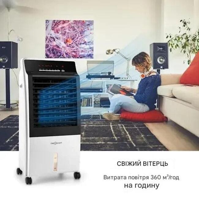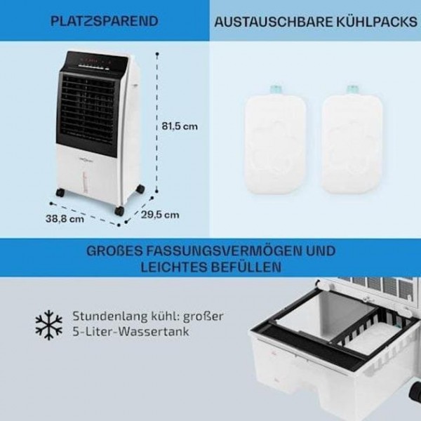 Повітроохолоджувач oneConcept CTR -1 4-в-1 повністю мобільний завдяки чотирьом базовим колесам і може легко супроводжувати вас у будь-яке місце, адже ви завжди хочете, щоб прохолодний вітерець був поруч з вами. Його низьке енергоспоживання всього 65 Вт і чисто фізичний принцип охолодження роблять його не тільки економічним, але й екологічним.