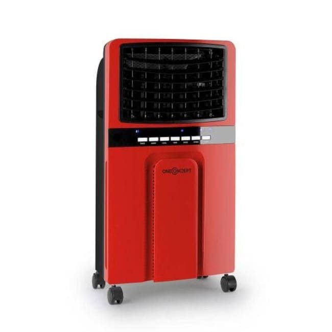 Будучи вентилятором, Baltic Red змушує свої ламелі вібрувати горизонтально на трьох рівнях швидкості та створює освіжаюче дихання, навіть коли повітря скрізь буквально застійне. Таким чином пристрій переміщує до 360 м³ повітря за одну годину. Якщо увімкнути функцію охолодження, повітроохолоджувач починає випаровувати воду зі свого 6-літрового бака, що помітно охолоджує повітря, що проходить повз. Цей процес базується на суто фізичних принципах і тому не потребує охолоджуючої рідини та дуже низьку потребу в енергії лише 65 Вт. Щоб ще більше підвищити ефективність охолодження, пакети з льодом, що входять у комплект, можна заморозити та додати в резервуар для води або просто додати кубики льоду в резервуар для води. Це робить oneConcept Baltic Red бажаним помічником як зволожувач навіть взимку, оскільки він безперервно зволожує сухе повітря, що нагрівається. Повністю мобільний повітроохолоджувач 3-в-1 слідує за вами в будь-яке місце завдяки своїм підлоговим роликам, щоб освіжити вас саме там, де вам це потрібно: за робочим столом, на дивані чи під час приготування їжі на кухні. Baltic Red поставляється з власним пультом дистанційного керування для зручного керування.