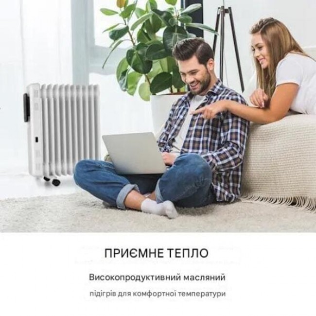 Завдяки 24-годинному таймеру для ввімкнення та вимкнення Ви можете спати спокійно та спокійно, поки масляний радіатор все ще працює: він надійно вимикається після вибраного часу. Невелика вага і 4 підлогові ролики, за допомогою яких електрообігрівач може легко змінювати своє розташування, забезпечують мобільне використання .