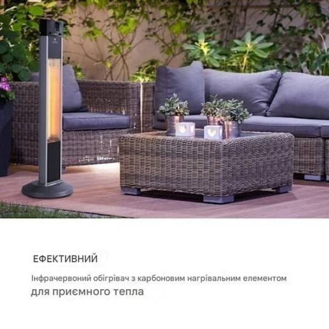 Карбоновий нагрівальний елемент потужністю 2000 Вт забезпечує високу потужність нагріву та ефективне випромінювання. Ви можете вибрати між 3 рівнями нагріву 650, 1350 і 2000 Вт. Система IR ComfortHeat не тільки дуже швидко доставляє тепло, але завдяки високоефективному рефлектору та довгохвильовому інфрачервоному випромінюванню, вона також виділяє його спеціально для людей та предметів поблизу, не нагріваючи повітря. Насолоджуйтеся затишним теплом з першої секунди! Таймер дозволяє автоматично вимикатися через 1-24 години. Обігрівачем blumfeldt Heat Guru можна керувати на пристрої або за допомогою пульта дистанційного керування, що входить у комплект. Завдяки IP34, прожектор є захищений від бризок і струменів води і ідеально підходить для використання на вулиці. Завдяки компактним розмірам і малій вазі він надзвичайно мобільний і може використовуватися скрізь, де це необхідно.