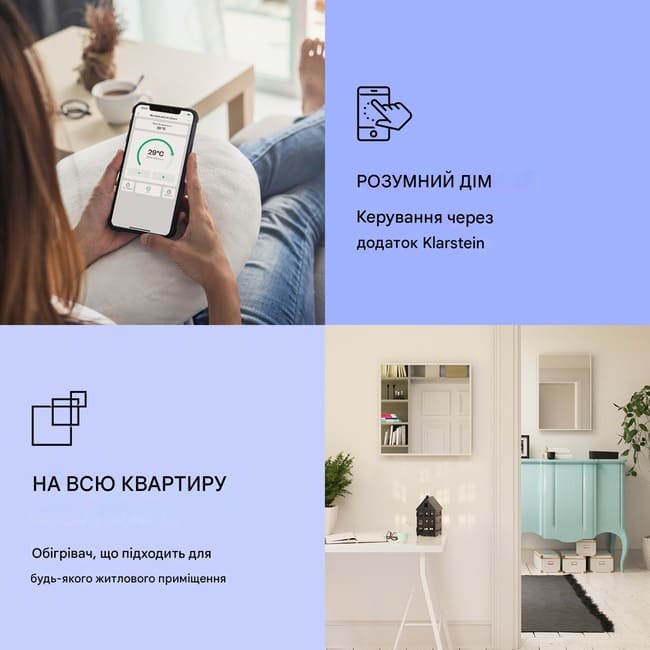 Керування здійснюється через сенсорну панель або мобільний додаток Klarstein. Регульований термостат, тижневий таймер та функція виявлення відкритих вікон забезпечують економне та безпечне використання.