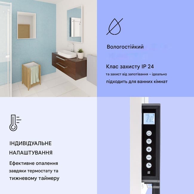Захист IP24 дозволяє встановлювати обігрівач у ванних кімнатах. Дзеркальна передня панель з антизапотіваючим покриттям поєднує функції обігріву та практичного дзеркала.