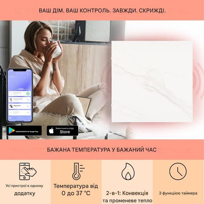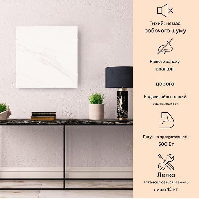 Завдяки ультратонкому корпусу розміром 60 × 60 см панель легко монтується на стіну та не займає корисного простору. Потужність 500 Вт забезпечує швидке прогрівання приміщення: близько 30% тепла передається у вигляді інфрачервоного випромінювання, яке безпосередньо зігріває людей і предмети, а 70% формується конвекційною системою для нагріву повітря.