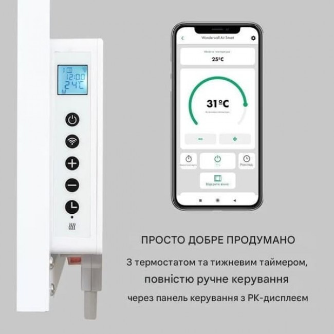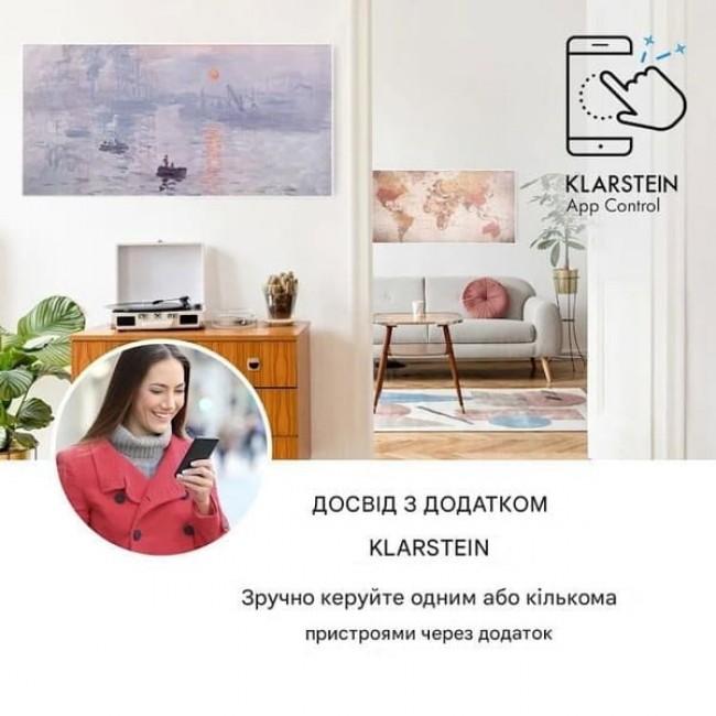 Інфрачервоний обігрівач Klarstein Wonderwall Air Art Smart поєднує в собі високоефективний нагрів із привабливим дизайном та інноваційними технологіями. Нагрівальна панель розміром 120 х 60 см може бути повісена прямо на стіну, і її розміри трохи перевищують картину в рамці. Завдяки своїй потужності 700 Вт і завдяки інфрачервоному обігріву ComfortHeat він поширює дуже приємне тепло на шкіру людини, не втрачаючи його в повітрі. Завдяки інфрачервоній технології нагрівальна панель надзвичайно енергоефективна та екологічно чиста: 98% енергії перетворюється на теплове випромінювання. Інтелектуальні функції для керування через додаток, термостат, функція автоматичного відключення та клас захисту IP44 вміло завершують інновацію.