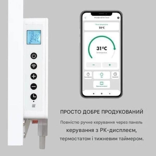 - Просто продумано: з термостатом, тижневим таймером і панеллю керування з РК-дисплеєм